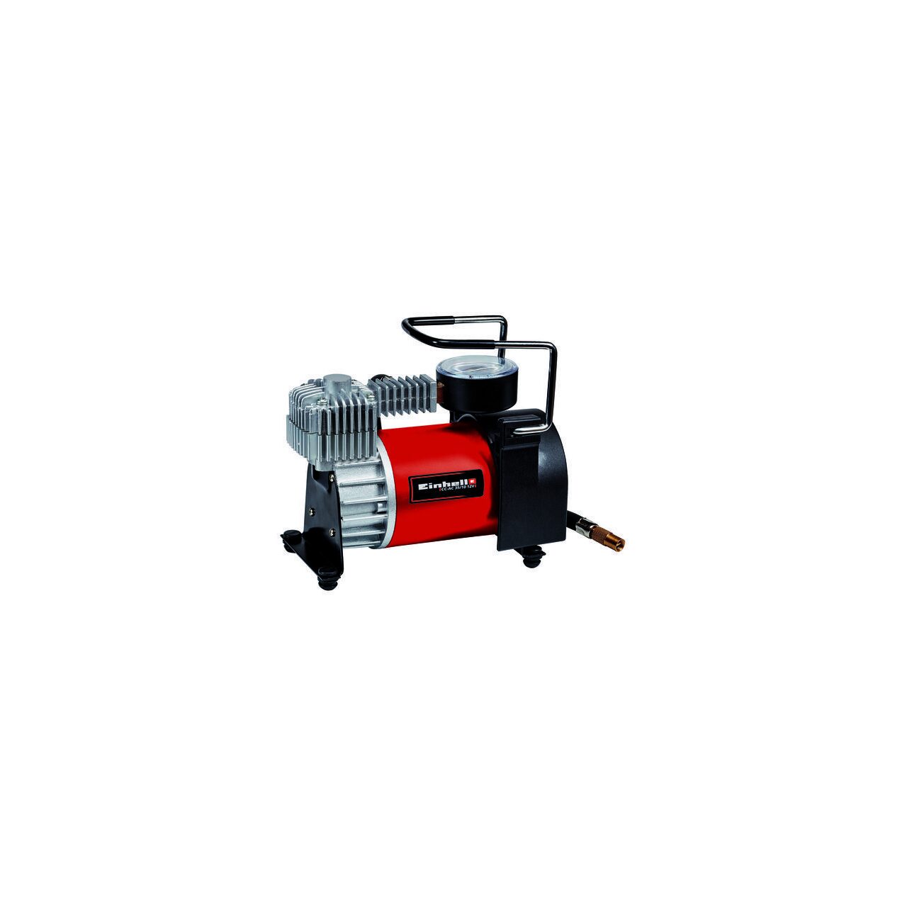 Compresorul pentru masina Einhell CC-AC 35/10 12V este un compresor de inalta performanta, special facut pentru utilizare flexibila si mobila. Genereaza un debit de pana la 35 de litri pe minut. Datorita conexiunii de 12 volti cu priza de bricheta si cablului de alimentare de 2.8 m, se pot efectua rapid si oriunde diferite lucrari cu aer comprimat, cum ar fi, de exemplu, umflarea anvelopelor unui autovehicul, unei motociclete, biciclete, umflarea mingilor, a saltelelor pneumatice mici etc. Pe manometrul incorporat presiunea curenta a aerului poate fi citita intre 0 si maxim 10 bari. Furtunul de aer este prevazut suplimentar cu un racord cu ventil Schrader pentru anvelope de masina si se poate utiliza intr-un mod versatil cu ajutorul celor 4 adaptoare auxiliare furnizate (ventil Dunlop, minge cu apa, saltea pneumatica si adaptoare de minge).
